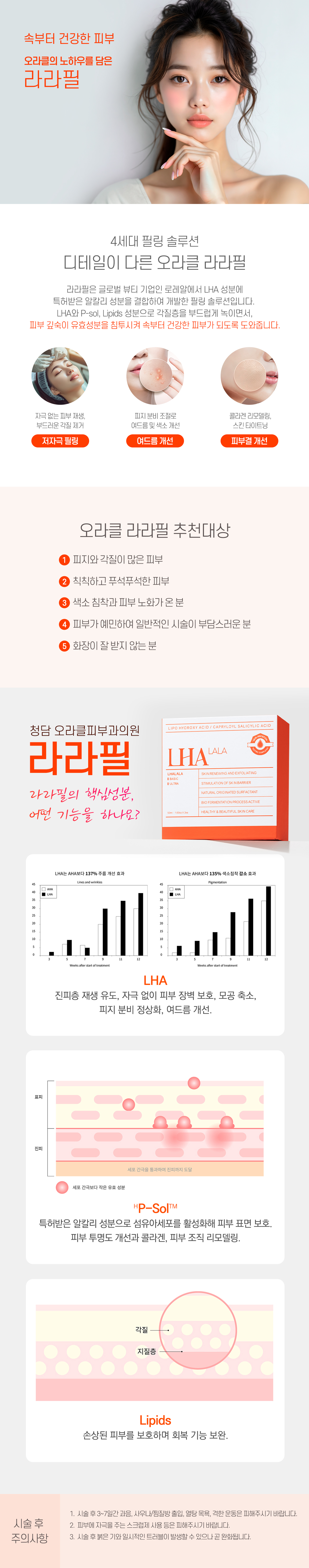 - Lipids : 손상된 피부를 보호하며 회복 기능 보완라라필은 글로벌 뷰티 기업인 로레알에서 LHA 성분에 특허받은 알칼리 성분을 결합하여 개발한 필링 솔루션입니다.